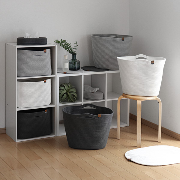 柔らかな素材感のロープストレージで統一すると、家族がのんびりくつろげる空間に仕上がります。高い耐久性を持ち、ロングライフな暮らしに溶け込みます。