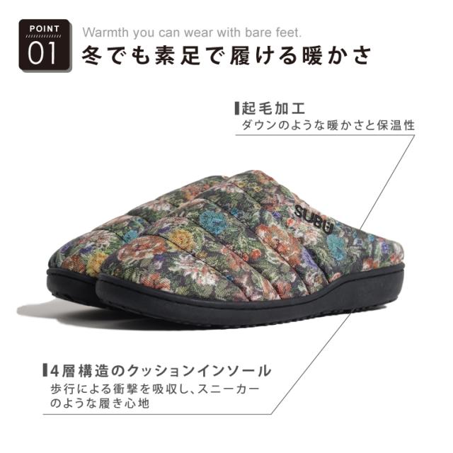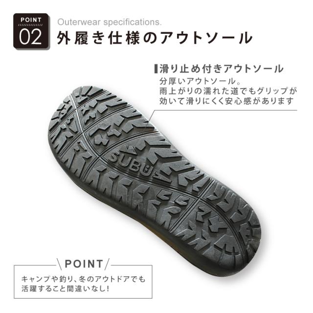 | 備考 | ●SUBUは株式会社イデアポートの登録商標(商標権No.5945697)/登録意匠権(意匠権No.1586567)です。 ●商品画像に関して、モニターやご利用の環境によって色や風合いの見え方が異なりますので、ご理解の上ご購入ください。 ●濡れた床面等、滑りやすい場所でのご使用時には十分ご注意ください。 ●長時間の歩行はお控えください。 ●運転時の使用はお控えください。 ●火の側や高温になる場所で使用しないでください。軟化や変形の恐れがあります。 ●アッパー部分に撥水加工をしていますが、防水ではありません。市販の防水スプレーをご使用の上、着用することをおすすめします。 ●足のサイズは目安です。サイズが合わない事による返品・交換はできかねます。サイズをよくご確認の上ご注文ください。 ※その他、商品に記載されている注意書きをよくお読みの上ご使用ください。 |
