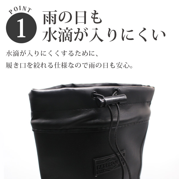 水滴が入りにくくするために、履き口を絞れる仕様なので雨の日も安心。