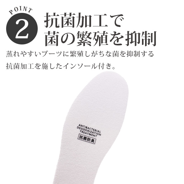 蒸れやすいブーツに繁殖しがちな菌を抑制する抗菌加工を施したインソール付き。
