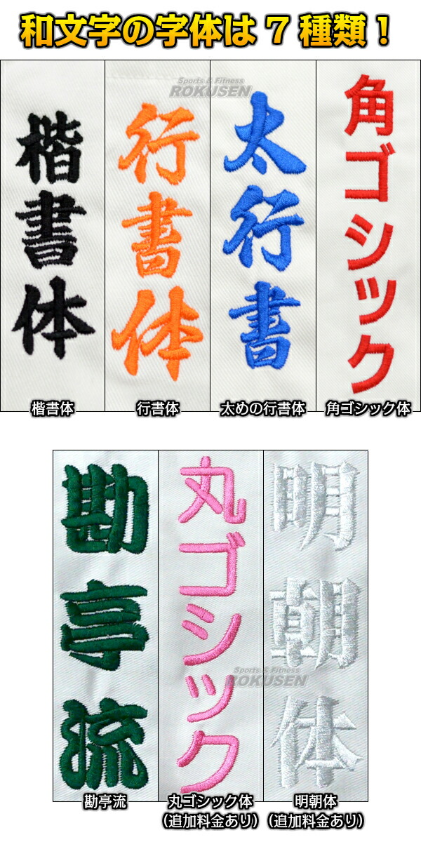 所属チーム様や学校様による字体の指定がある場合や、既に刺繍済の柔道着をお持ちで同じ書体をご希望のお客様、特殊な書体をご希望のお客様は「書体指定」をお選びいただき、書体または刺繍済み柔道着の写真をメールで当店までお送りください。⇒メールの送り先はこちら(wowma@rokusen.com)