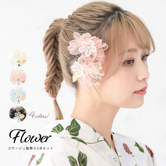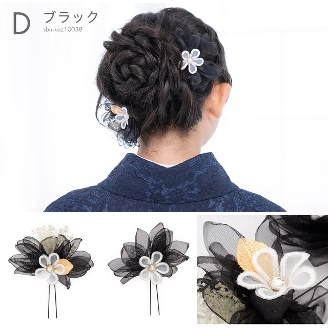 髪飾り 成人式 白 ピンク 青 黒 かすみ草 2点セット オーガンジー 振袖 卒業式 袴姿 浴衣 フェイクパール ビジュー 花 Uピン 送料無料