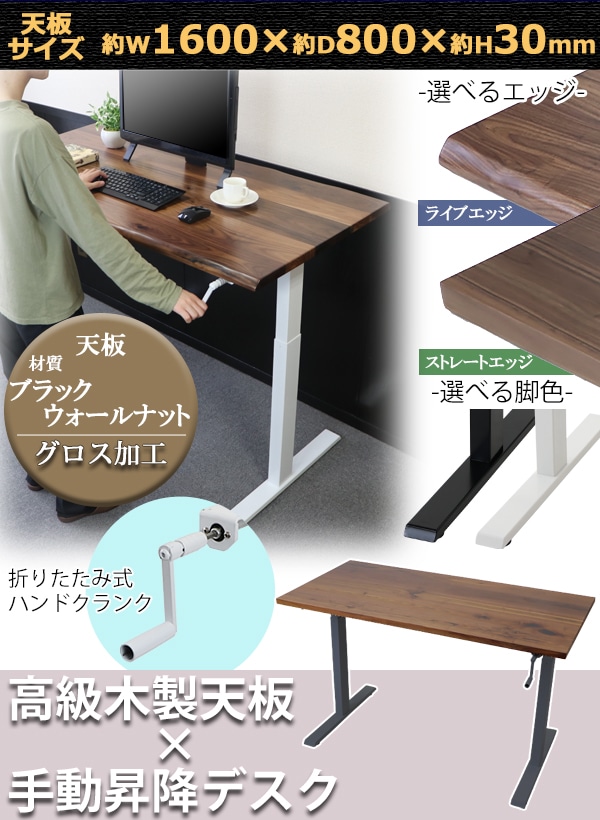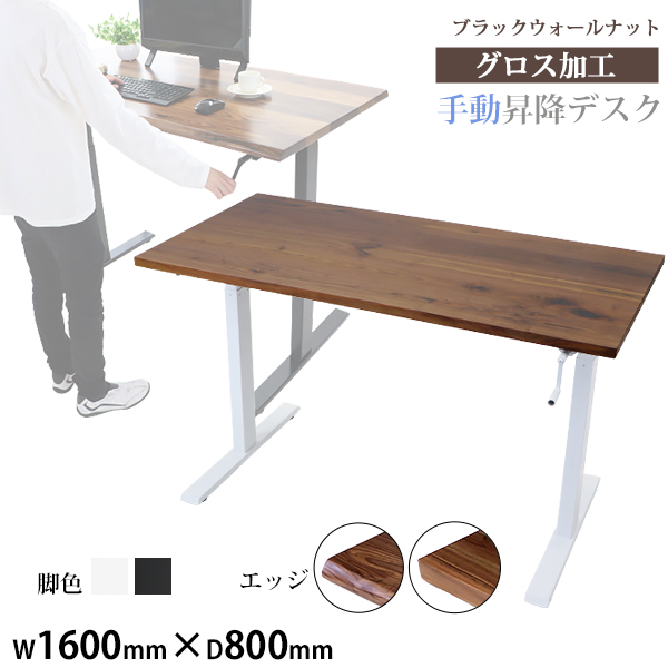 昇降デスク 手動 W1600×D800×H735〜1185mm ブラックウォールナット材 高級 木製 天板 グロス加工 耐荷重約70kg脚部 スタンディングデスク 上下昇降 デスク 手動昇降 上下昇降 昇降デスク 高さ 調整 オフィスデスク 昇降式デスク 昇降テーブル hk01160bkwag