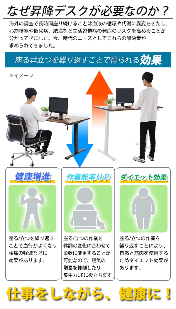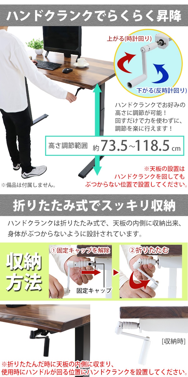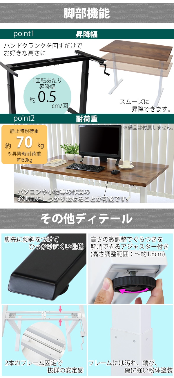 ■生活のシーンに合わせて使える手動昇降デスクです。 ■手動式で、体格や作業に合わせて天板の高さをスムーズに調整出来ます。 ■横幅調整も可能で、色々な幅の天板に対応可能! ■耐荷重:約44kg(ライブエッジ天板の場合)、約44kg(ストレートエッジ天板の場合) ※この商品の場合のデスク上に設置可能な荷物の総重量です。 【天板】 ■空間に高級感と華やかさを与えてくれる美しい木目の天板です。 ■天板の表面には「グロス加工」が施され、肌触り滑らかで光沢のある美しい仕上がりです。また防水性にも優れ、お手入れも簡単です。 ■ライブエッジ、ストレートエッジの2種類のエッジ(端)タイプからお選びいただけます。 ■材質:ブラックウォールナット(無垢材)(グロス加工) ■重量:約26kg(ライブエッジ)、約26kg(ストレートエッジ) ※天然木のため、木目に関しては一点一点が異なります。あらかじめご了承ください。 ※天板には表と裏があります。肌触りが滑らかな方が表側です。 ※天板の表裏には黒い部分(木の穴や節などの修復部分)が数か所ある場合がございます。品質には問題ございませんので、ご安心ください。ただし、商品の性質上黒い部分の大きさや数は天板一点一点異なります。よくご検討の上、ご購入をお願い致します。 【脚部】 ■材質:スチール(脚部フレーム)、プラスチック(アジャスター) ■重量:約21kg ■アジャスター付きです。 ■昇降幅:約0.5cm(1回転あたり) ■耐荷重:約70kg(脚部のみ) ※天板の重量によって、デスク上に設置可能な荷物の総重量は変わります。ご注意ください。 ■付属品:工具(5mm六角棒レンチ×1、2mm六角棒レンチ×1)、ハンドクランク、天板取り付け用ネジ、英語説明書 ※製造ロットや改善・その他の事由によりデザインや仕様が変更される場合があります。 ※こちらの商品は、組立て式です。 (プラスドライバーをご用意下さい。) ※天板を取り付ける際、ネジの取り付けが硬い場合は、インパクトドライバーをご準備の上ご使用下さい。 ★ご購入前の注意事項★ ●新品商品ではありますが、輸入商品の為、擦り傷等があります。ご納得の上、ご購入下さいませ。 ●ご購入後、お客様ご都合によるご返品、ご返金等は一切お受け致しておりません。 ●本商品を使用した際に発生したトラブル、事故につきまして、当社は一切の責任を負いません。 ご使用に関しましては、全て自己責任にてお願い致します。 |