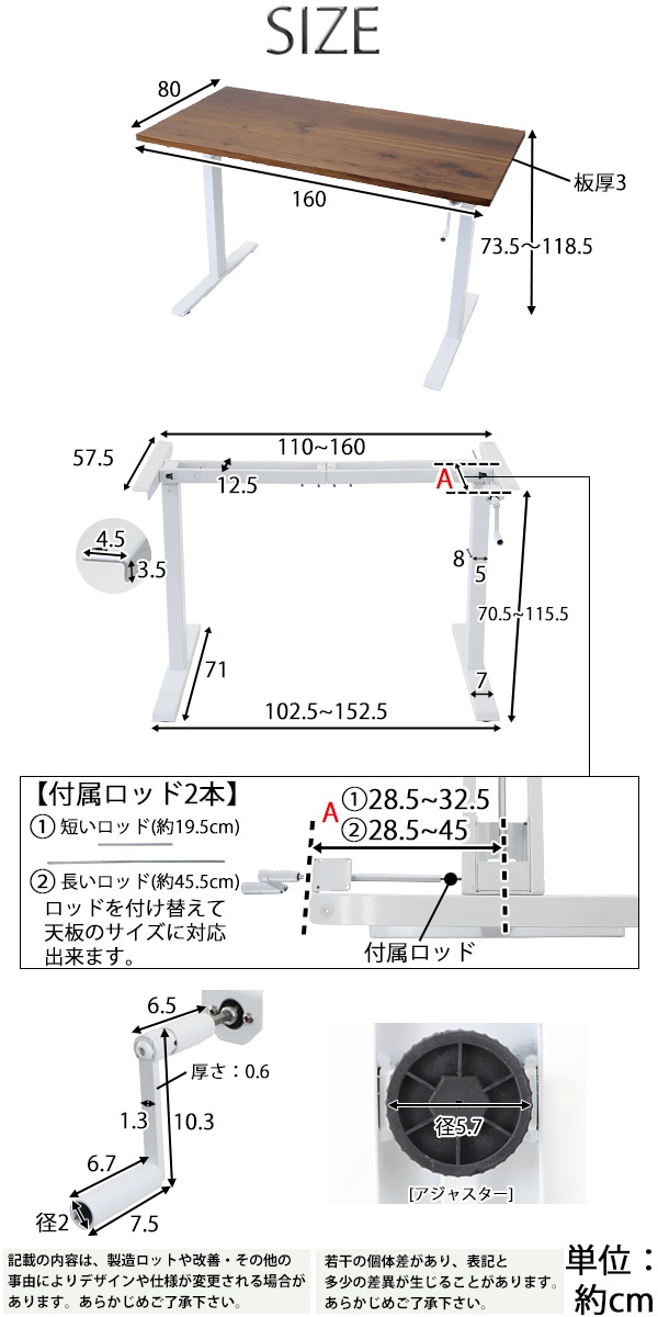 | 脚部寸法 | 約W 110〜160x約D 71x約H 70.5〜115.5(cm) |