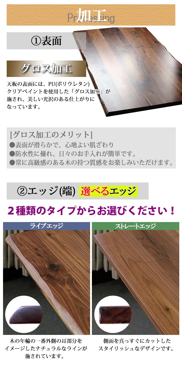 | 梱包サイズ(2個口) | 天板:[ライブエッジ]約W 165×約D 84×約H 6(cm)/約30kg [ストレートエッジ]約W 165×約D 84×約H 6(cm)/約30kg 脚:約W 105×約D 25×約H 19(cm)/約23kg |