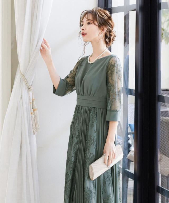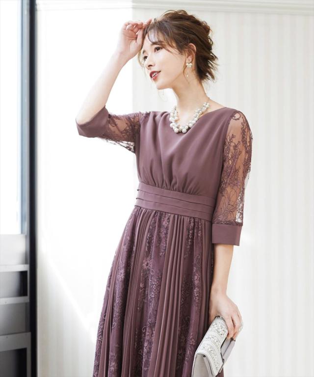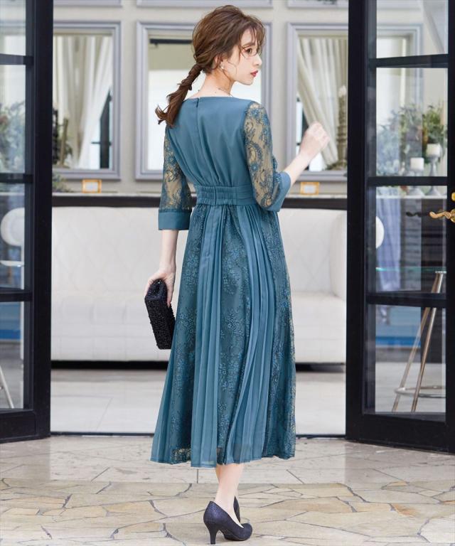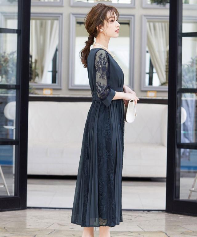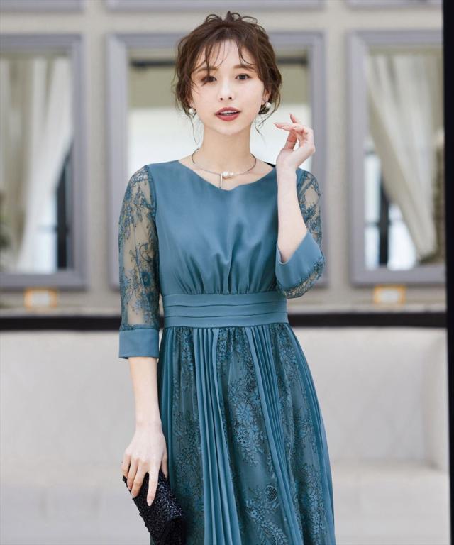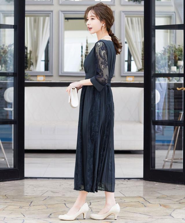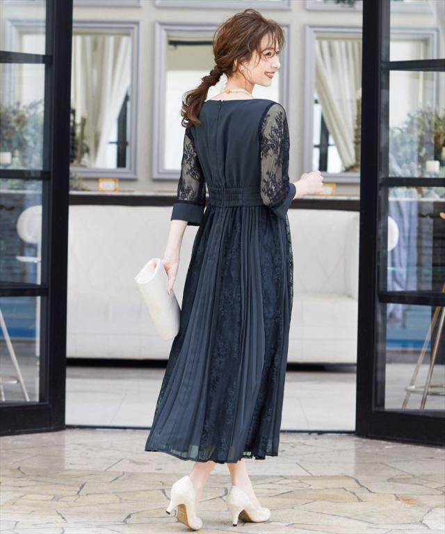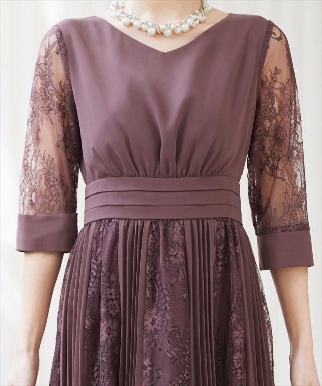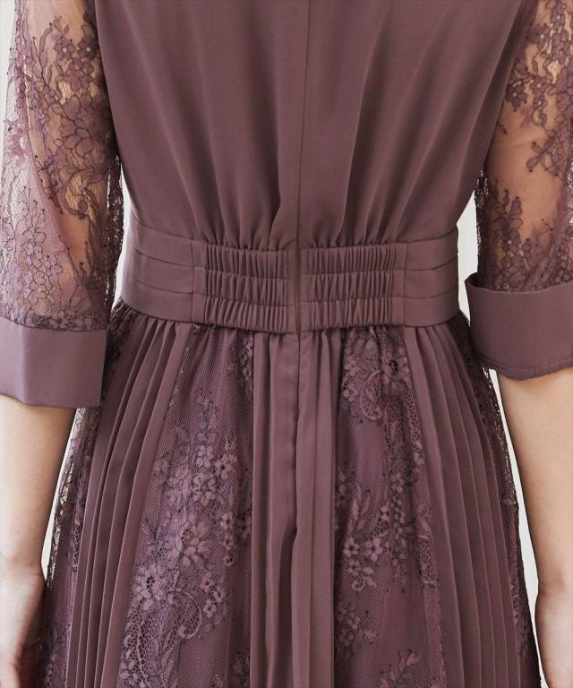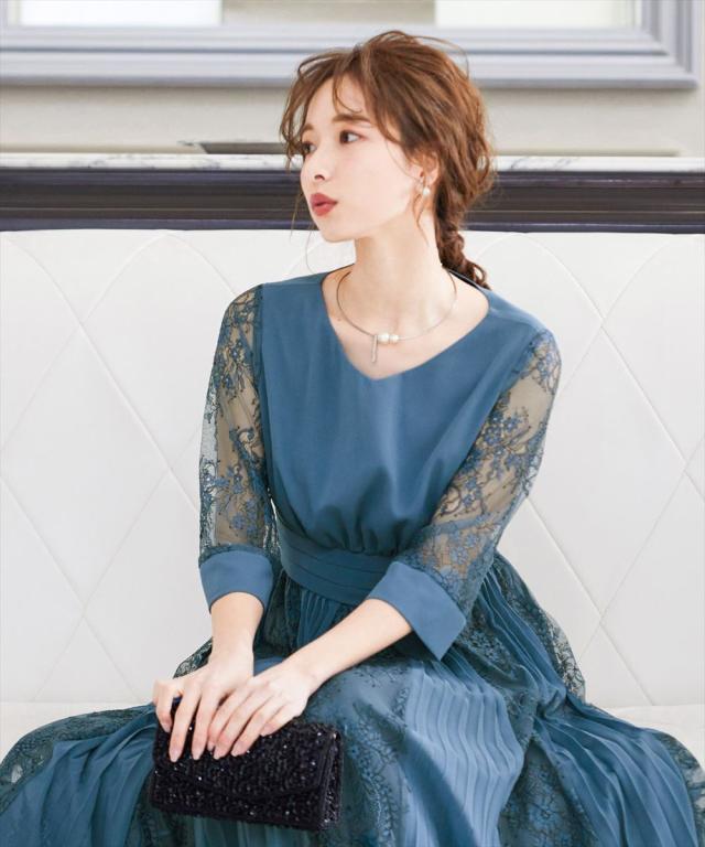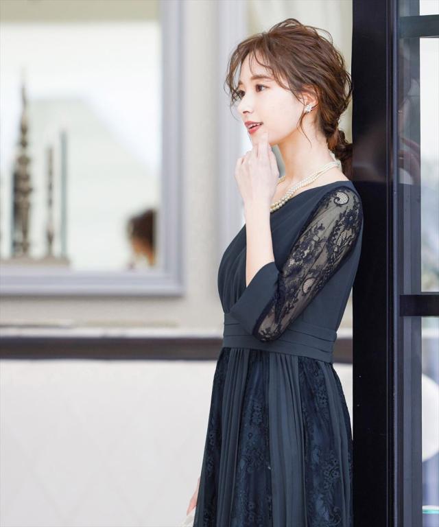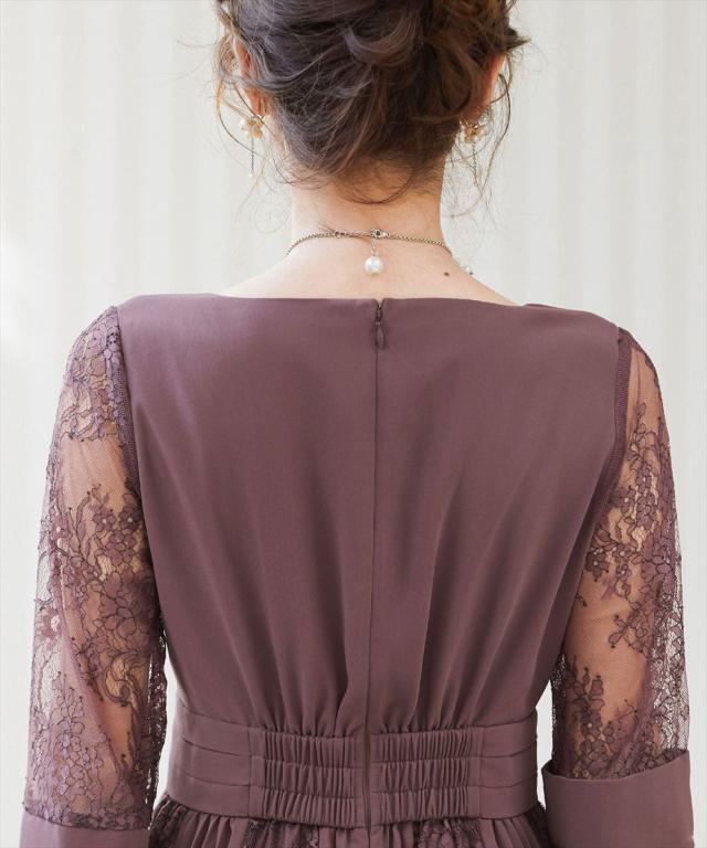 程よい透け感のレーススリーブが二の腕をさりげなくカバー。