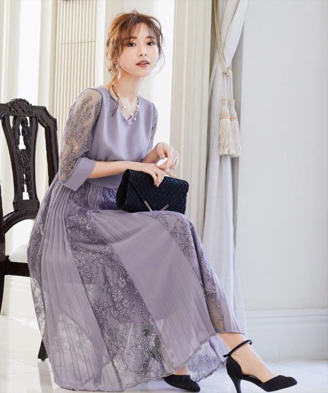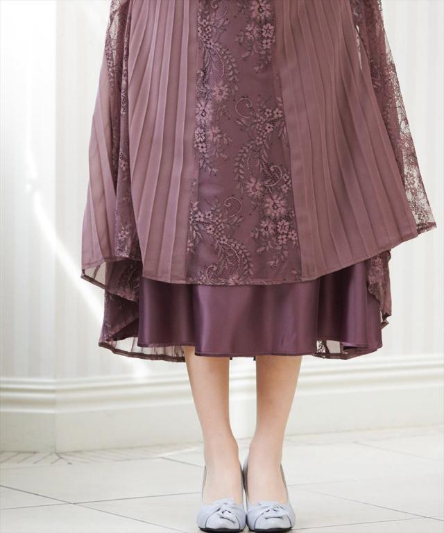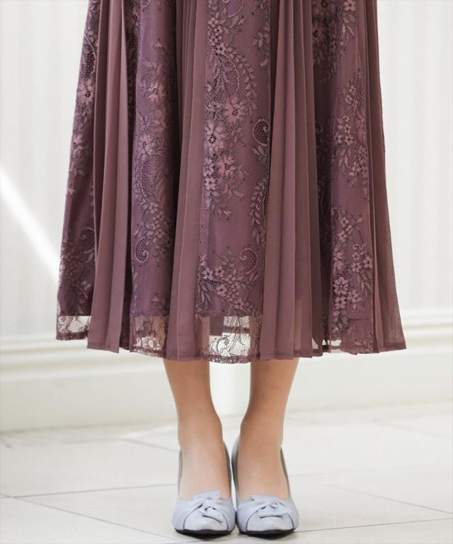 レースとプリーツをミックスさせたロングスカートが動くたびに揺れ、エレガントな余韻を残す。