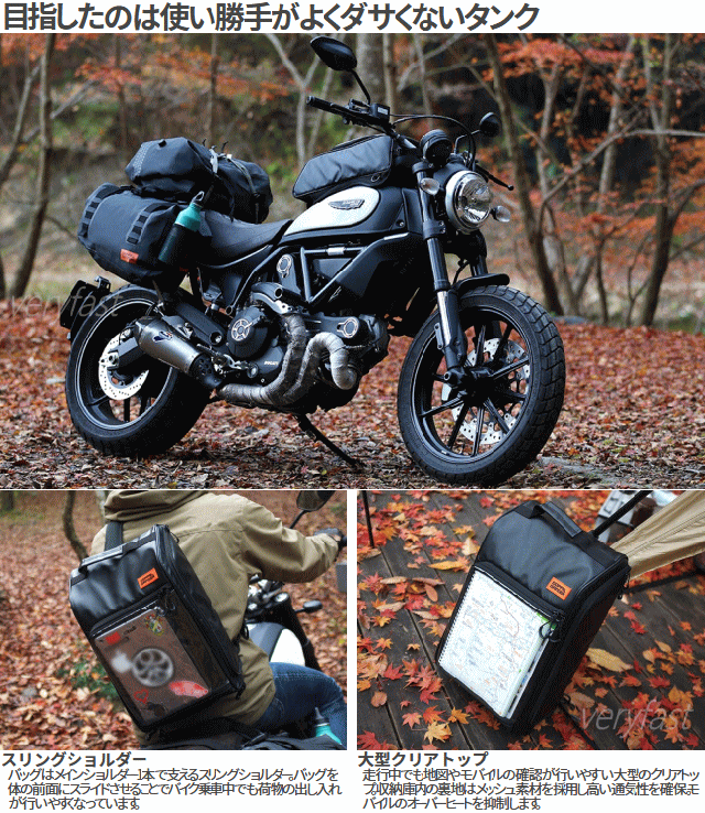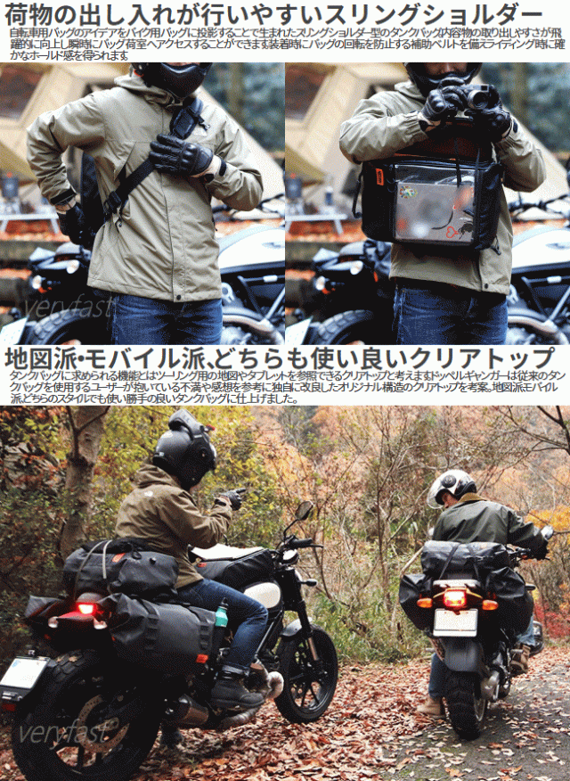 ![]() バイク乗車中でも荷物の出し入れが行いやすくスリングバッグにもなる デジモノ収納にも優れるバイク用タンクバッグ。 一般的なタンクバッグはバイクの燃料タンクに装着する事を前提にデザインされており「いかにもタンクバッ グ」といったバッグの形状、デザインになりがちです。ドッペルギャンガーはタンクバッグとしての機能性を 維持しつつ使い勝手の良さと普段使いしやすいファッション性を兼ね備えた理想のタンクバッグの製品化を目 指しました。 ![]() ![]() ![]() ![]() ![]() ![]() |