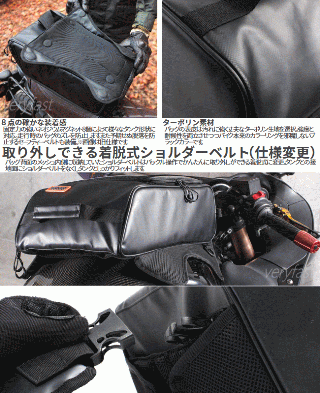 バイク乗車中でも荷物の出し入れが行いやすくスリングバッグにもなるデジモノ収納にも優れるバイク用タンクバッグ。一般的なタンクバッグはバイクの燃料タンクに装着する事を前提にデザインされておりいかにもタンクバッグといったバッグの形状、デザインになりがちです。タンクバッグとしての機能性を維持しつつ使い勝手の良さと普段使いしやすいファッション性を兼ね備えた理想のタンクバッグの製品化を目指しました。■カラー:ブラック■サイズW25×L(D)14×H42cm■製品総重量約1.1kg(付属品含む)■容量14L■最大積載重量2kg■材質:ターポリン■付属品:脱落防止ベルト×1、補助ベルト×1、ディバイダー×2■原産国:中国※過積載や片寄った積み方はしないで下さい。走行前は各部取り付け部に緩みがないか確認して下さい。本製品は防水仕様ではありません。固定用マグネットの磁気によって磁気カード情報の破損や精密機器の故障の恐れがありますので十分にご注意下さい。