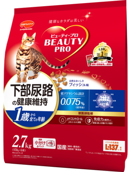 獣医師監修のビューティープロ。おいしく食べて健康を保ちながら、体調の良さと毛並みの美しさを実感。皮膚の健康と毛艶の維持にマリンコラーゲン3000mg/kg、ヒアルロン酸配合。ストルバイト結石に配慮しマグネシウムを0.075%(標準値)に調整。さらに、メチオニン強化。(ビューティープロ キャット 成猫用比約20%アップ)尿pH6.2~6.4(設計値)ハウスの乳酸菌L-137(TM)を配合。運動量が少なくなりがちな室内猫のために、たんぱく質35%以上で脂肪分を調整。天然食物繊維が毛玉の排泄を助ける毛玉対応。腸内の善玉菌を増やすオリゴ糖配合で、健康的な便を維持し便臭を軽減。室内で暮らす愛猫のためにGABA配合。着色料無添加。アルミ蒸着の新鮮小分け450g×6袋。