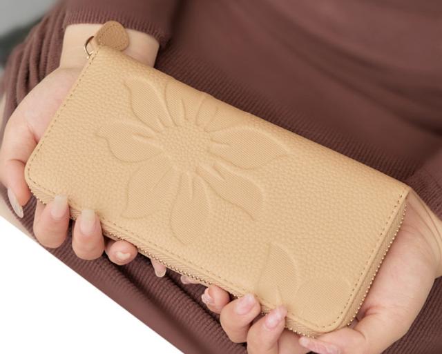 - 大安の日を待って使い始めた。以前の財布から全移動。余裕で入ってスッキリ。黒一色だが花型がアクセントになって優しい感じ。触感も良いです。