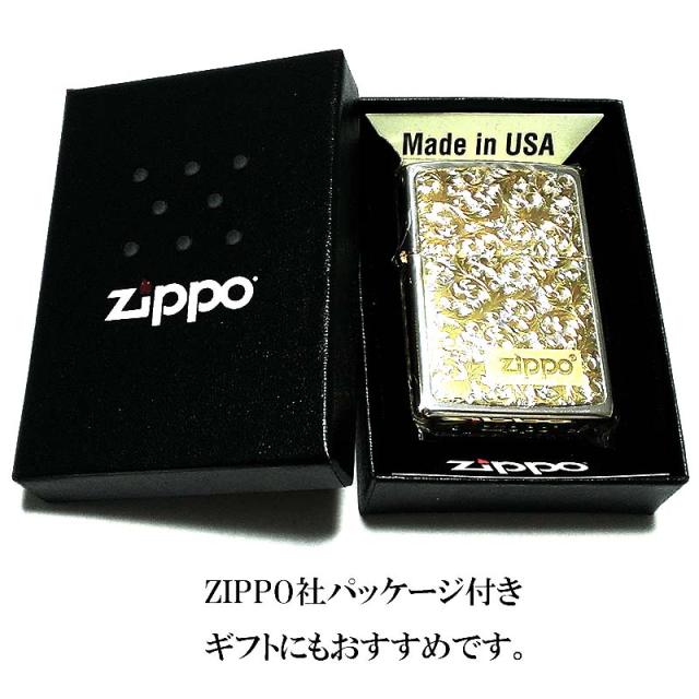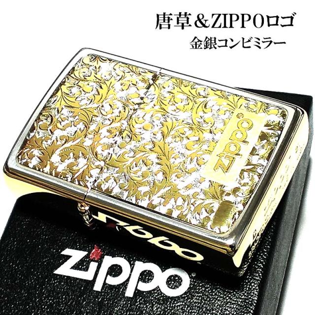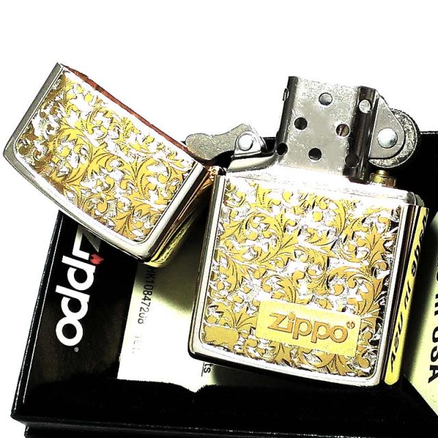ZIPPO ライター 唐草 ZIPPOロゴ シルバー&ゴールド サイドゴールド ジッポ ミラー仕上げ 彫刻 プレート貼り ツートーン鍍金 金銀