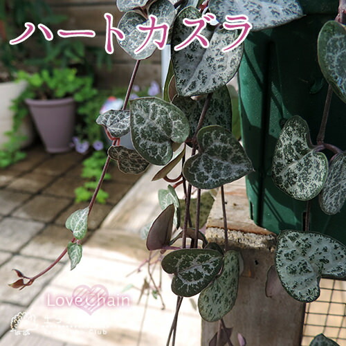 ハートカズラは、長く伸びた蔓に 1.5〜2cm程度のハート型の葉をつける多肉植物です。「ラブチェーン」とも呼ばれ、綺麗な模様のやや厚みのあるハート型の葉は 観賞価値が高く魅力的です。