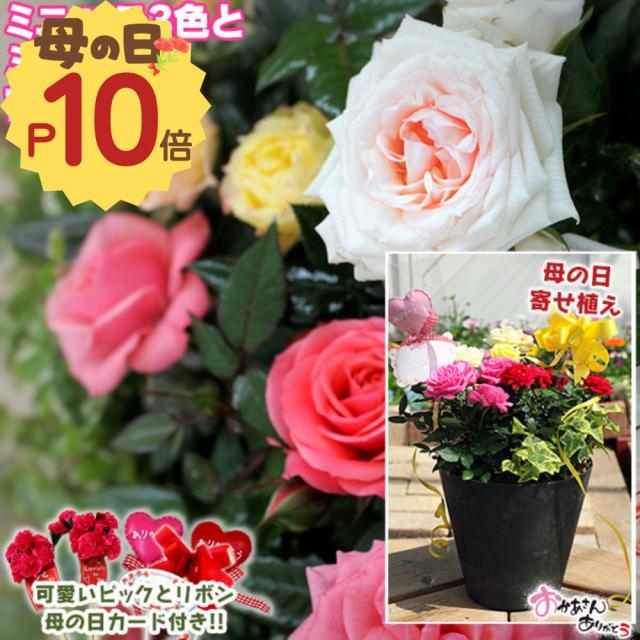 母の日 ミニバラ 3色と ミニ観葉 の 寄せ植え アートストーン 22cm鉢植え 【 選べる鉢色 】 送料無料 ギフト プレゼント