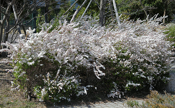 春先、桜のあとに白(淡いピンク)の小花を枝先まで帯状に咲かせます。春風になびく姿が美しい花木です。