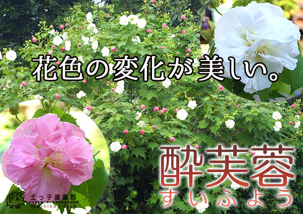 花色の変化が酒に酔っていくようなので「酔う芙蓉」で酔芙蓉(スイフヨウ)。白(朝)〜ピンク(午後)〜赤(夕方)に変化していきます。夏から晩秋にかけて次々と咲きます。
