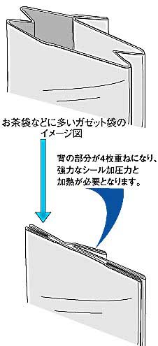 ![]() | ※1 上記イラスト例のようなガゼット袋であ れば、一番厚くなる箇所は、4枚重ねに なりますので、フィルム1枚の厚さが 0.125mm以下のものまでシール可能と お考え下さい。 総厚 0.5mm÷4枚=0.125mm (1枚当) | |