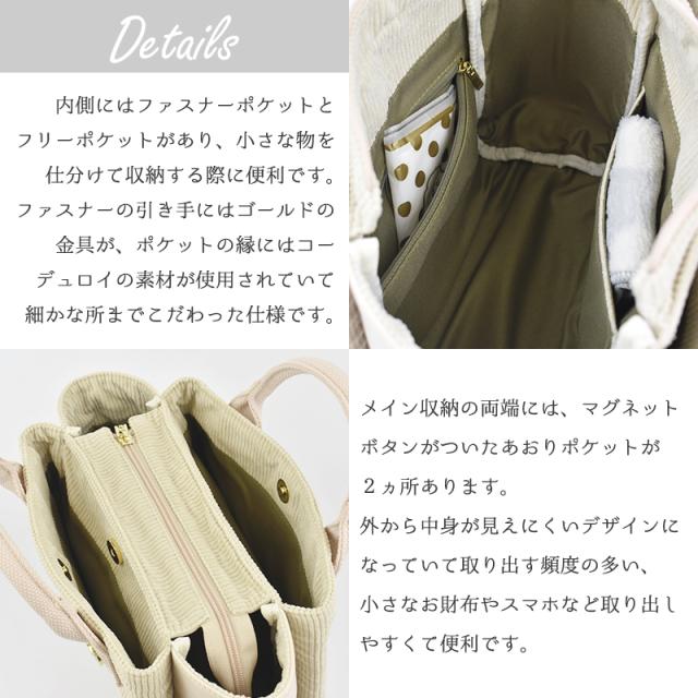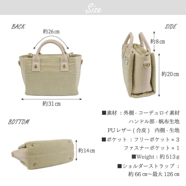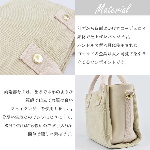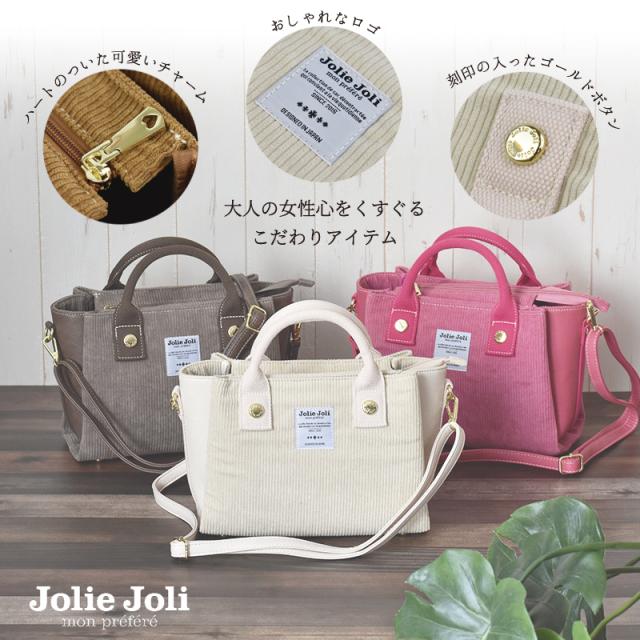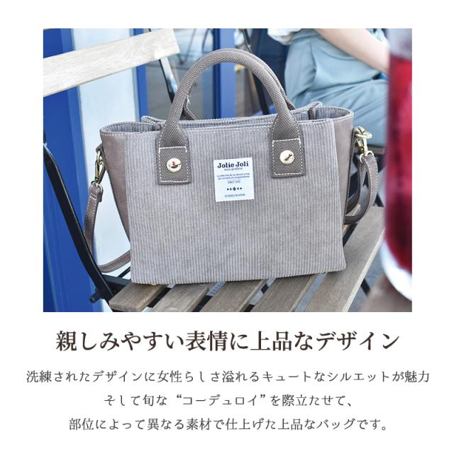 | 品名 | 2wayバッグ Jolie Joli ジョリージョリ 2way ショルダーバッグ レディース ミニトート 小さめ コーデュロイ 帆布 軽い かわいい 大容量 おしゃれ 合成皮革 合皮 フェイクレザー 軽量 カジュアル 通勤 通学 旅行 おでかけ 女性 ブランド カバン 自立 底鋲 人気 プレゼント 送料無料 |