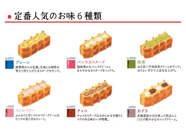 〇ワッフルケーキ:6個(プレーン、バニラカスタード、抹茶、ストロベリー、チョコ、あずき)(1個サイズ:約8cm×3.5cm×2.5cm)