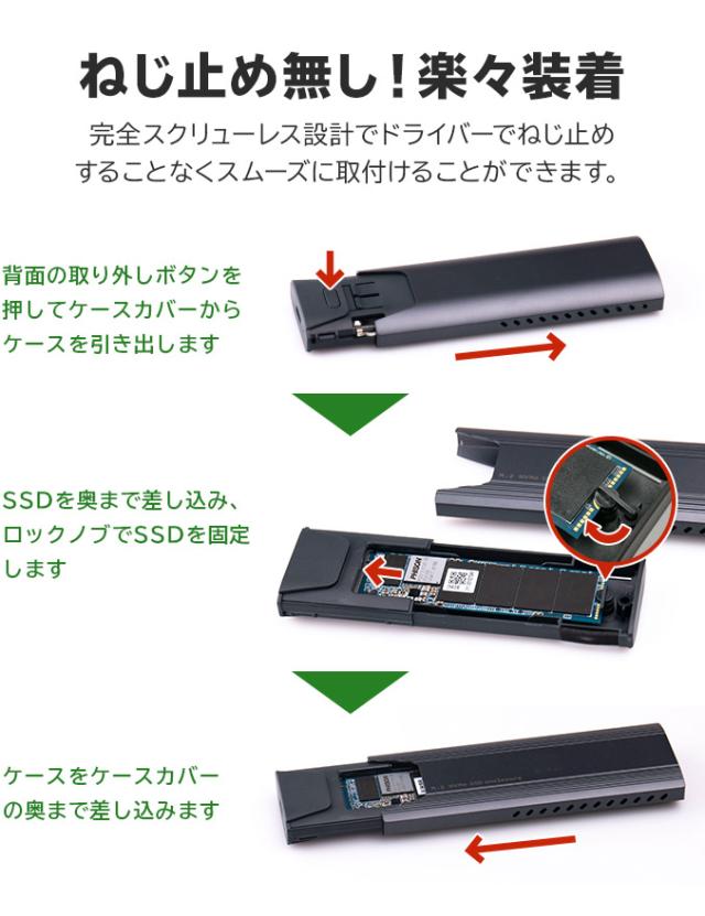 ・本製品はM.2 PCIe NVMe規格SSDに対応したSSDケースです。M.2SSDには複数の形状や規格があり、非対応のものを接続すると機器の故障のおそれがありますのでご注意ください。(M.2SATA規格SSDは使用できません)