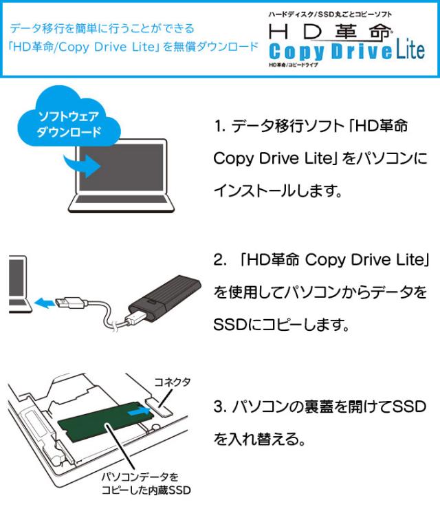 データ移行ソフト「HD革命CopyDriveLite」が付属。Windowsパソコンの環境をOSやデータ、インストール済みのアプリケーションも丸ごと別のハードディスクやSSDにそのままコピーできます。