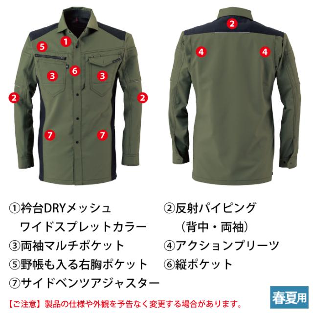 ◇機能:衿台DRYメッシュ、ワイドスプレットカラー、袖マルチポケット、野帳も入る右胸ポケット、反射パイピング(背中・両袖)、アクションプリーツ、縦ポケット