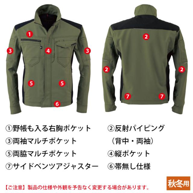 ◇機能:野帳も入る右胸ポケット、両袖マルチポケット、両脇マルチポケット、反射パイピング(背中・両袖)、縦ポケット、帯無し仕様、サイドベンツアジャスター