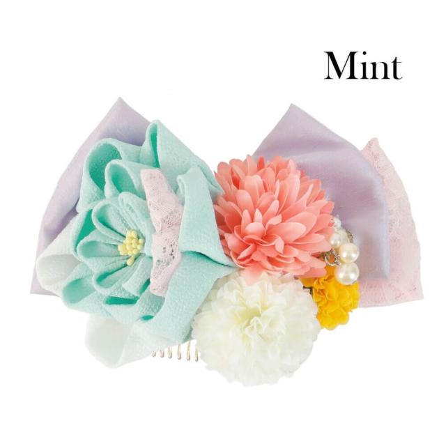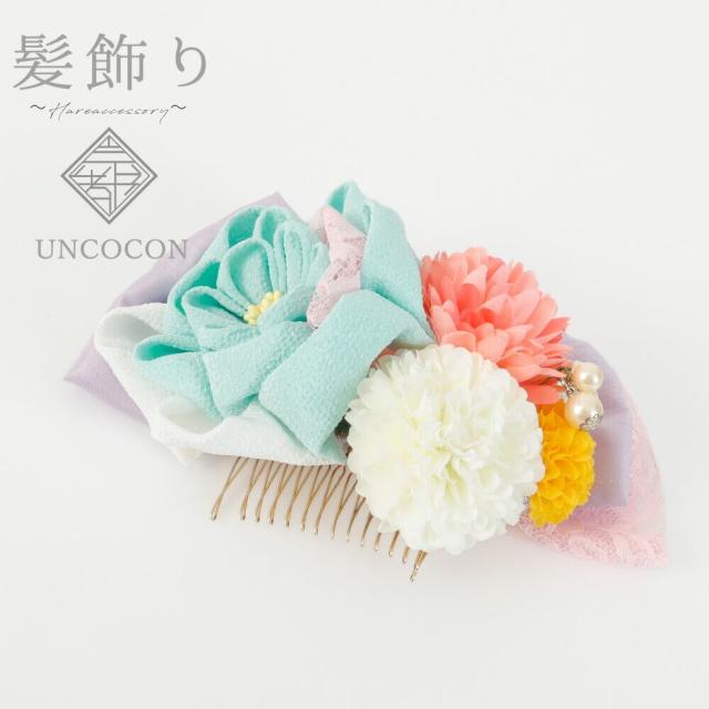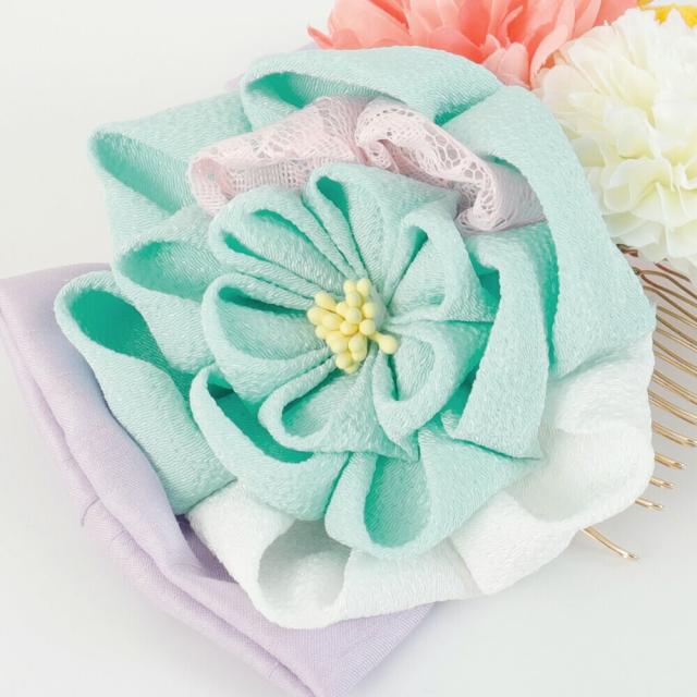 髪飾り 成人式 つまみ細工 水色 和装 白 ピンポンマム 花 コーム 卒業式 振袖 ちりめん レース 七五三 着物