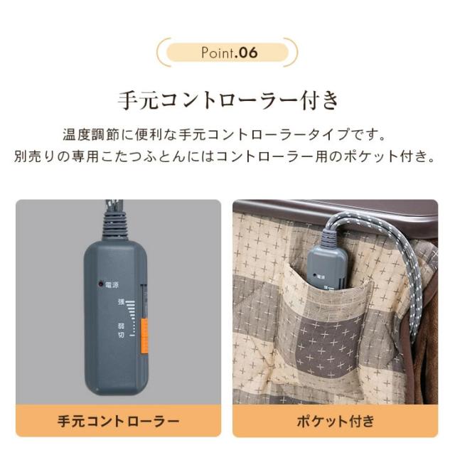 ●仕様/テーブル:ヒーター電源:AC100V(50/60Hz)、消費電力:600W、ヒーター定格電圧:交流100V、ヒーター発熱体:石英管ヒーター300W×2本、ヒーターコード:2.8m(手元コントローラー付き)、ヒーター温度調節方式:無段階調節ファン付き(華芝ジャパンKJU-600FC)、ふとん:両面リバーシブル(フランネル面:はっ水加工)