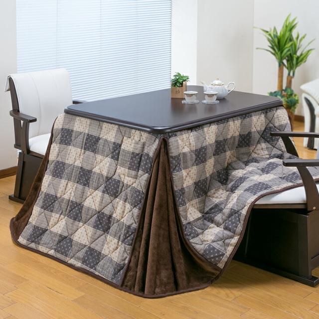 落ち着きのあるしじら織りの格子柄面と撥水加工のフランネル面と、両面つかえるリバーシブルこたつ布団です。両面ともに温度調節のコントローラーが収納できるポケット付き。布団のコーナー部分にはマチがついているので、熱を逃しにくい仕様になっています。