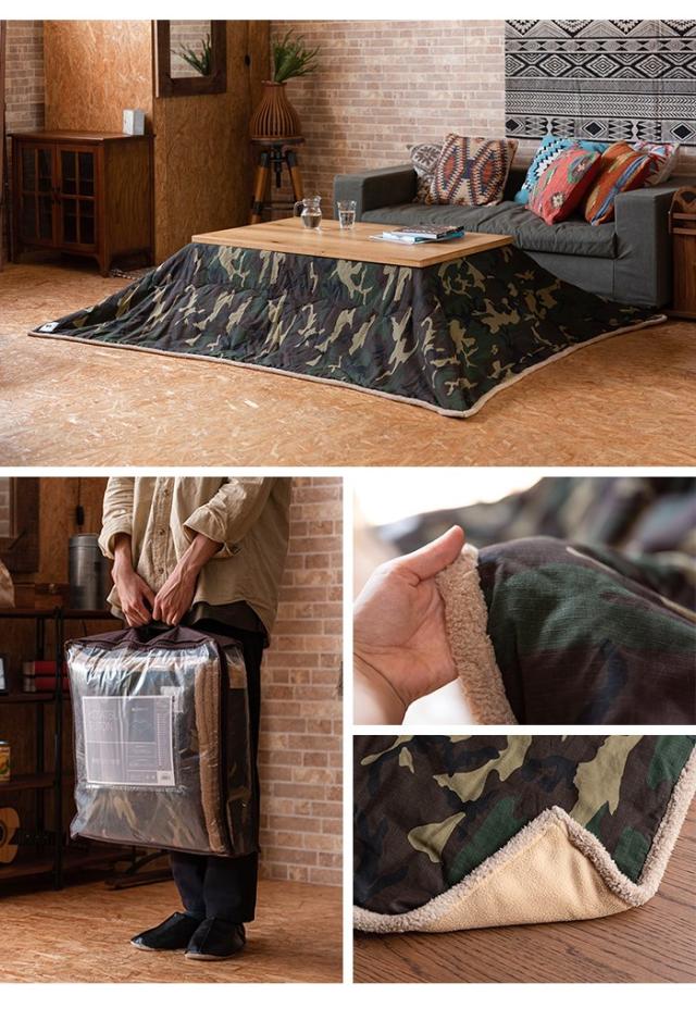 インパクトのある迷彩柄のこたつ布団。