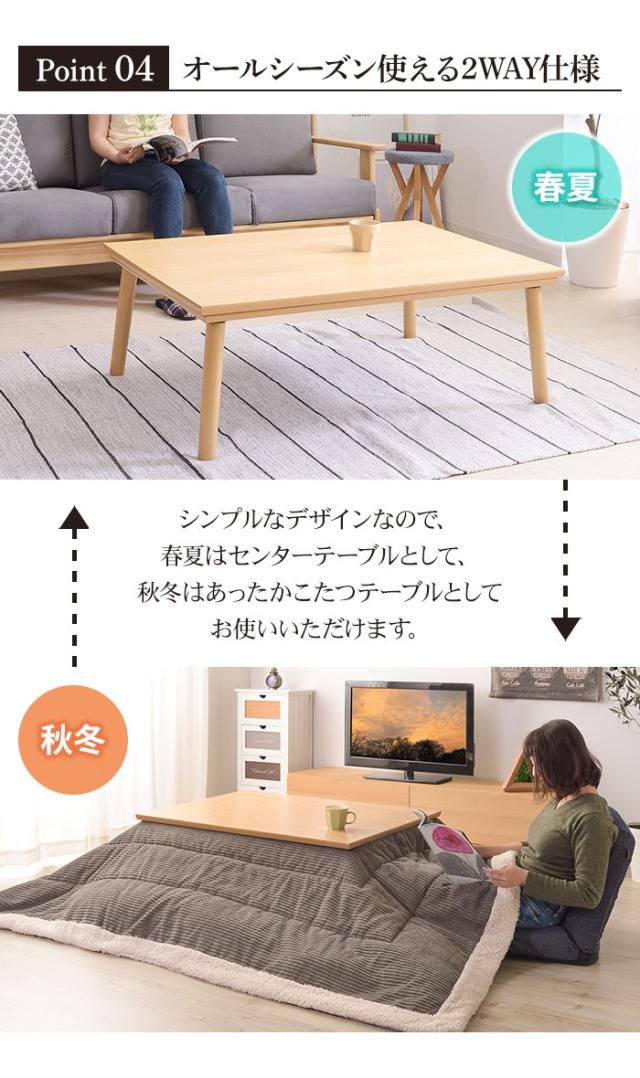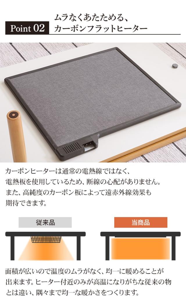 ヒーターが見えない薄型フラットヒーター採用こたつテーブル。