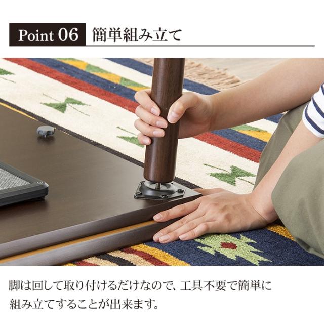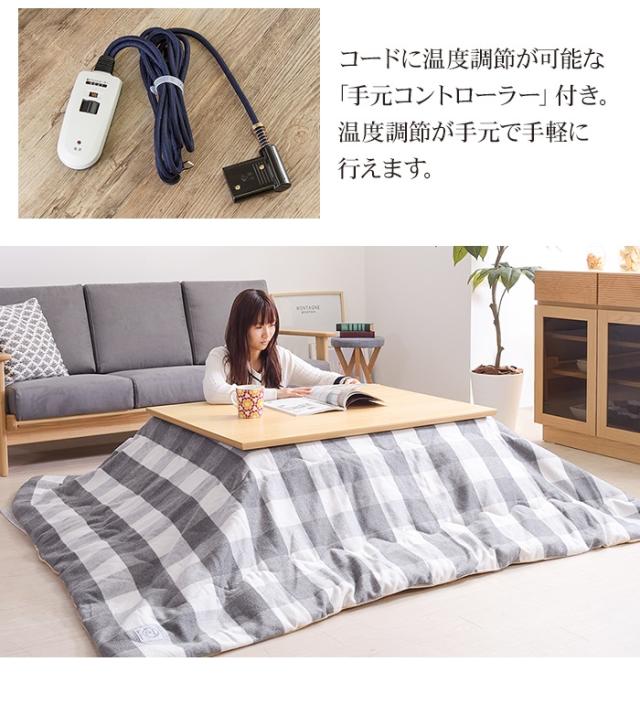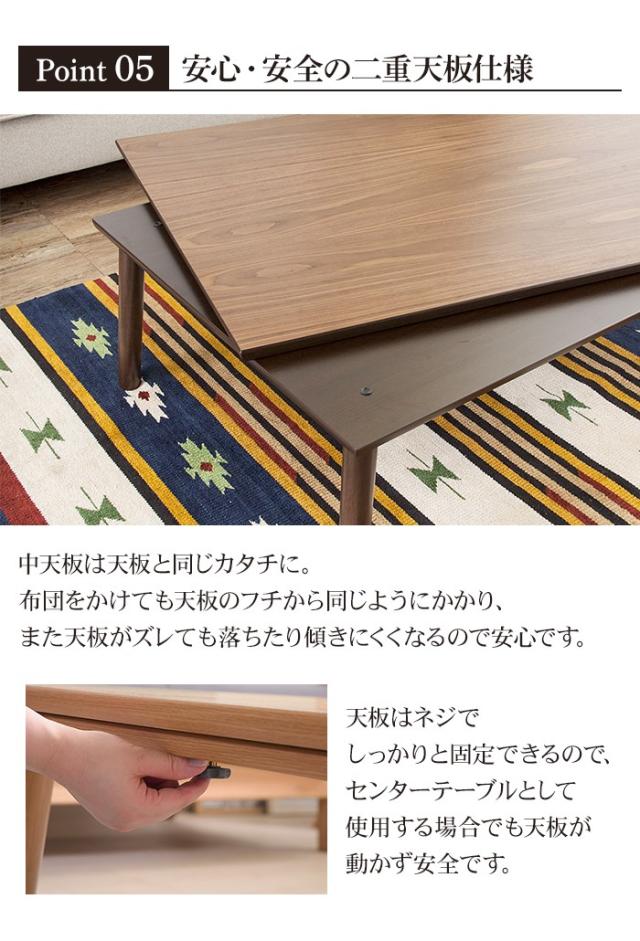 | ヒーターが見えない薄型フラットヒーター採用こたつテーブル。 従来の石英管ヒーターに比べ、フラットヒーターの薄型な形状で内部を広々と使えます。 面積が広いので温度のムラがなく、ヒーター付近のみが高温になりがちな従来のモノとは違い、隅々まで均一な暖かさを作ります。 カーボンフラットヒーターは通常の電熱線ではなく、電熱板を使用しているため、断線の心配がありません。 また高純度のカーボン板によって遠赤外線効果も期待できます。 薄型のフラットヒーターを活かすため、シンプルなデザインにこだわったフォルムと質の良い天然木ウォールナットの深みのある風合いが極上のリビングを演出。 さらに木の風合いを残したままハイレベルなUV塗装を施しています。 コードに温度調節が可能な手元コントローラーがついているので、温度調節が手元で気軽に行えます。 脚は回して取り付けるだけなので、工具不要で簡単に組み立てることができます。 |