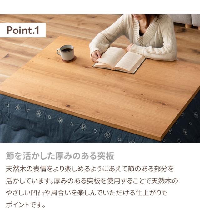 天然木の表情を楽しめるようあえて節を活かした厚みのある突板を使用し、天然木のやさしい凹凸や風合いを楽しめるこたつテーブルです。