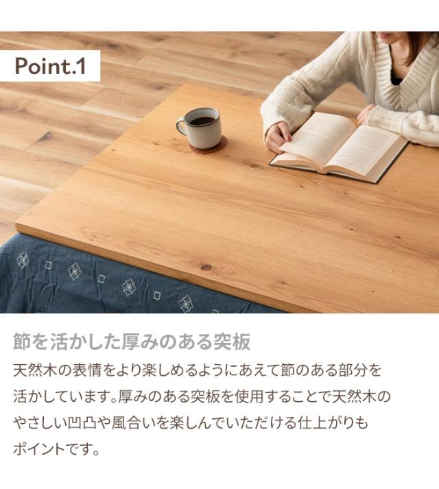 天然木の表情を楽しめるようあえて節を活かした厚みのある突板を使用し、天然木のやさしい凹凸や風合いを楽しめるこたつテーブルです。