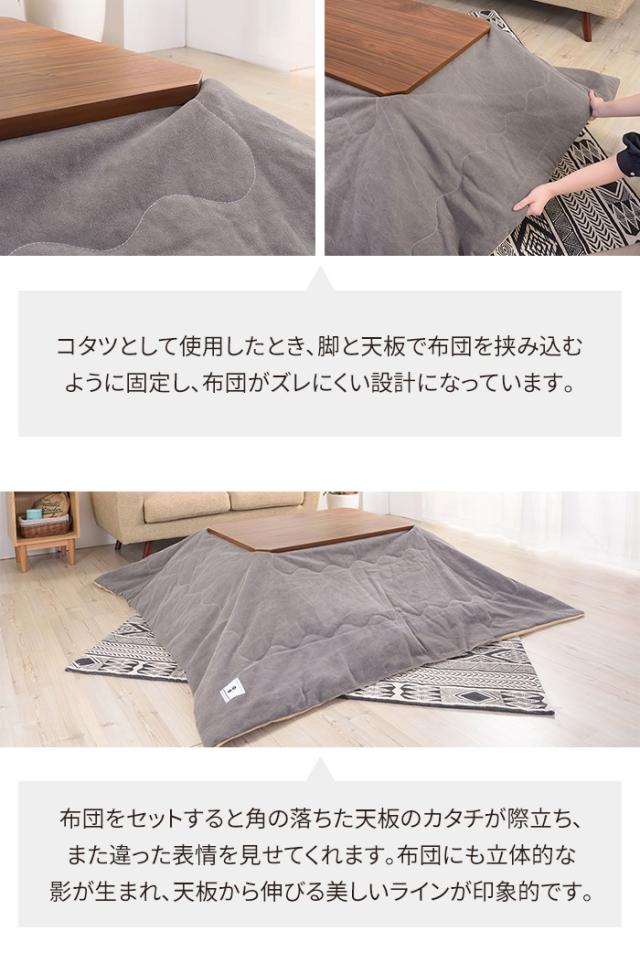 こたつとして使用する際に、脚と天板で布団を挟みこむように固定し、布団がズレにくい設計になっています。