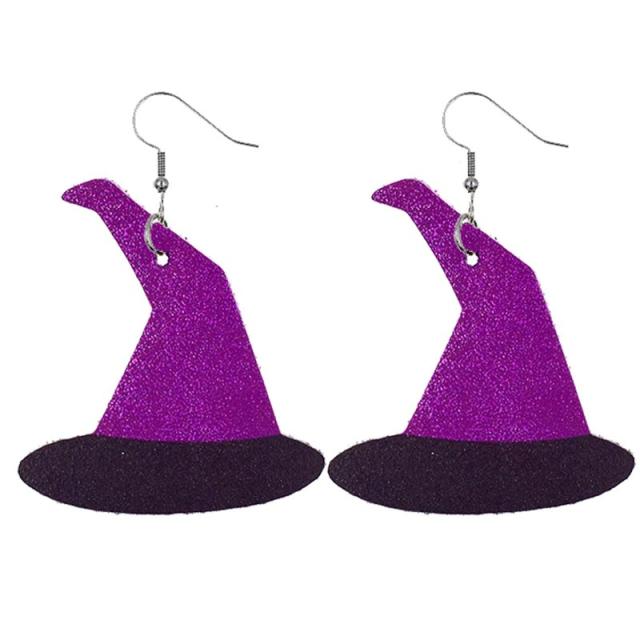 皮製のレザーに紫色パープルと黒色ブラックのラメで魔法使いの三角帽子をデザインした可愛いファッションピアス。