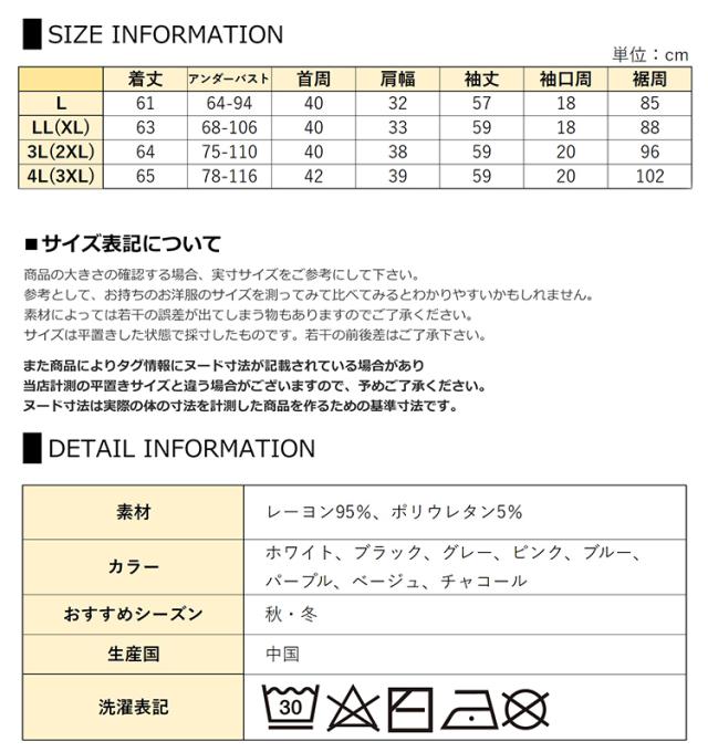 4L(3XL):着丈65 アンダーバスト78-116 首周42 肩幅39 袖丈59 袖口周20 裾周102