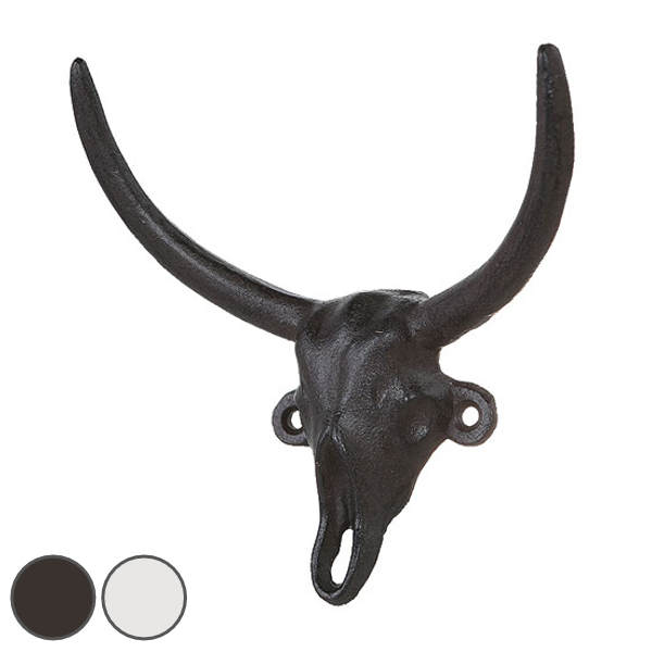 雄牛のスカルをモチーフにしたアイアン製のフックです。付属のネジで壁に取り付けます。角の部分がフックになっているデザインで、装飾としてのみならず実用性も兼ね備えています。