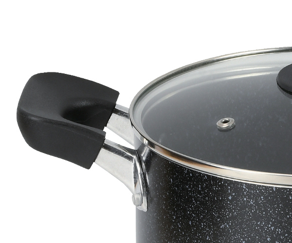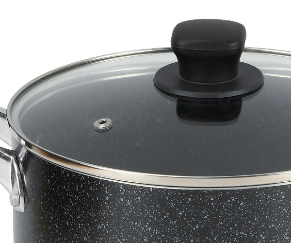 | 材質 | 本体:アルミニウム合金 表面加工:ふっ素樹脂塗膜加工 はり底:ステンレス鋼(クロム16%) 取っ手:フェノール樹脂 蓋:強化ガラス 縁リング:ステンレス鋼 つまみ:フェノール樹脂 つまみの座板:ナイロン |