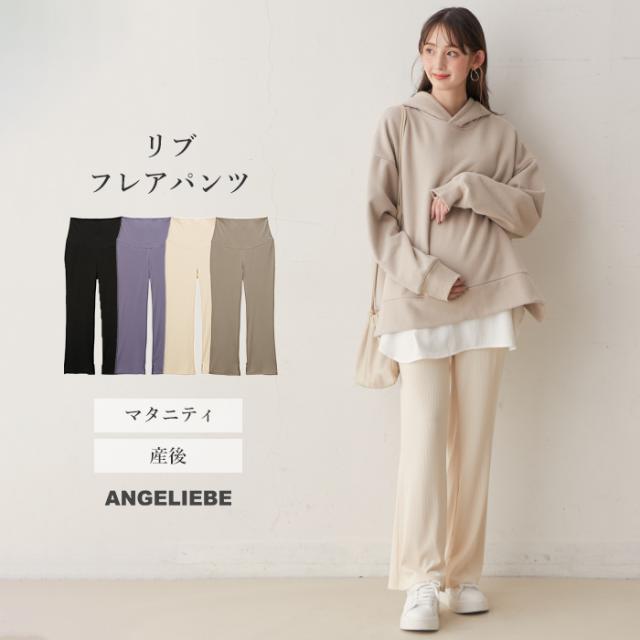 美シルエット マタニティ 服 パンツ ストレッチ リブ フレアパンツ 妊婦服 長ズボン マタニティパンツ ワイドパンツ 無地 大きいサイズ