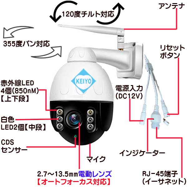 本製品は、カメラの焦点距離を調整できる電動レンズ機構の他に カメラを撮影したい方向に動かすことができる パン・チルト機能も搭載しております。
