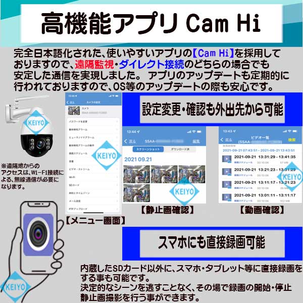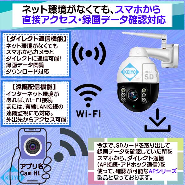 従来機種と同じように、本体内に録画機を内蔵しておりますので 電源のある場所に設置してすぐに、録画システムを構築可能な上 SDカードを取り出さなくても、スマホから録画データのダウンロードや 閲覧が可能となっております。