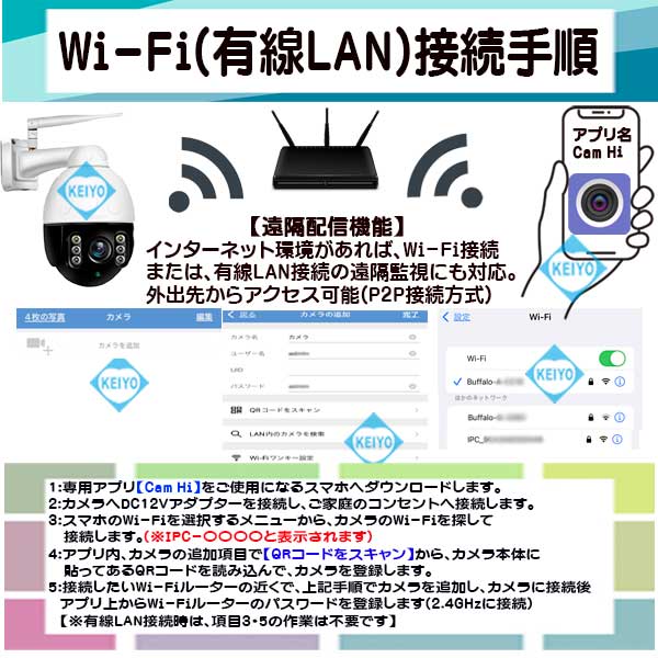 カメラはWi-Fi機能を搭載しています。(IEEE 802.11b/g/n 2.4GHz対応) カメラがWi-Fiにつながっていると、どこにいてもスマホから ライブ映像・録画データの確認を行えます。