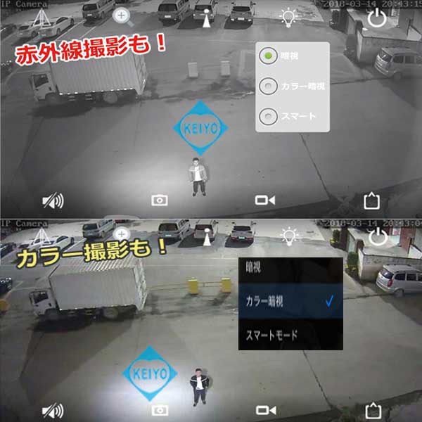 暗い時に常時点灯させるモードと、人や物が映像上に映った際のみ 照射するセンサーライトモードがあります。