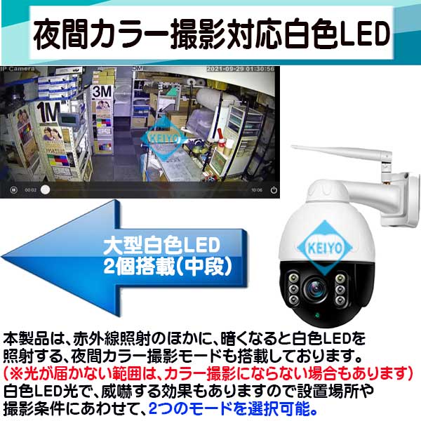 夜間でも、カラー撮影を行うために白色LED照射モードも 搭載しております。