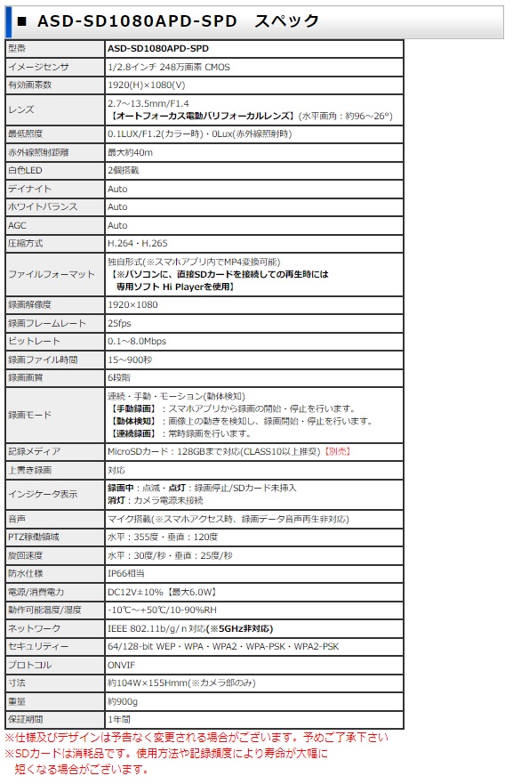 ASD-SD1080APD-SPDZは、アナログハイビジョン信号の AHD1.0方式を採用した、屋内設置用SDカード録画カメラ ASD-SD720AHDを屋外設置・フルHD・IPカメラ化し 遠隔監視や直接スマホからアクセスする、AP接続モードに対応させた PTZ(パン・チルト・ズーム)機能付上位機種になります。