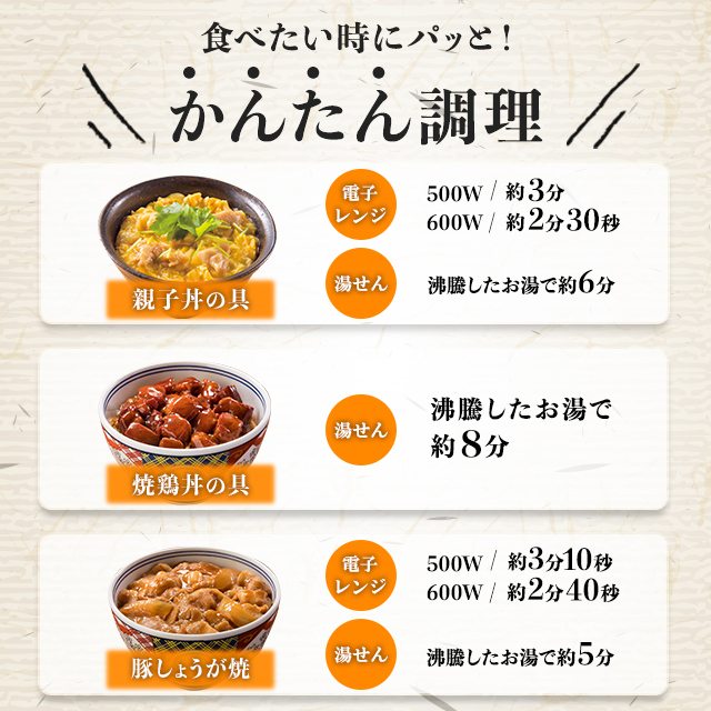 商品名 吉野家 お試しセット 牛丼の具、豚丼の具、牛焼肉丼の具、親子丼の具、焼鶏丼の具、豚しょうが焼、紅生姜 容量 牛丼の具120g×2食