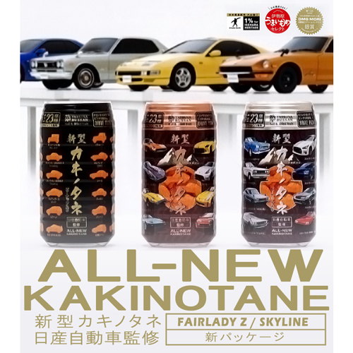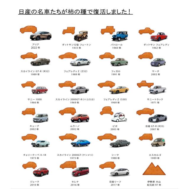 日産自動車が監修のうえ生まれた柿の種(米菓)は、23種類の日産の歴史的名車と伊勢原市のシンボルである「大山」を模したデザインになっています。